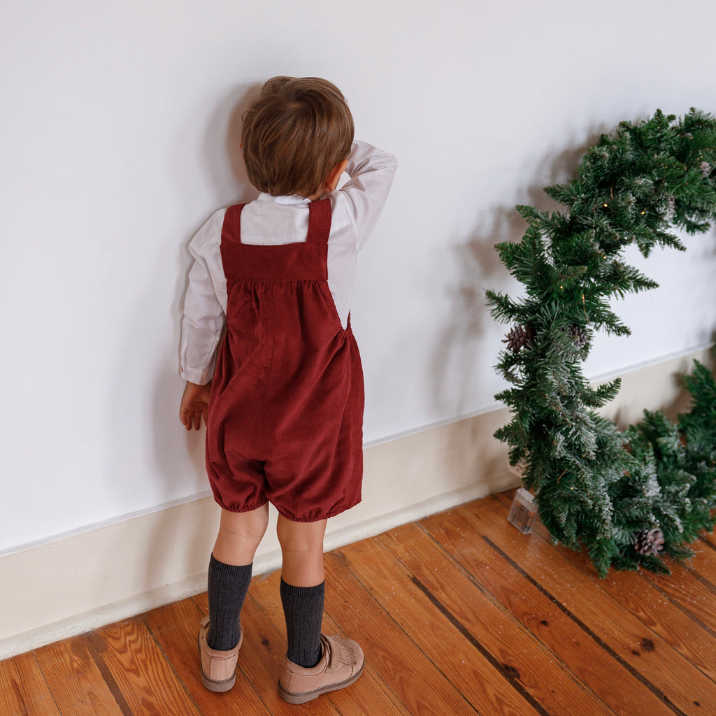 Jardineiras de calções em veludine bordeaux com dois botões nas alças, abertura entre pernas ( até aos 2A)